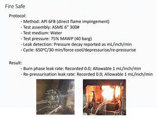Cryogenic testing was also conducted, which is a’ Blowdown’ qualification for between -110C and -196C. Again, this was a pressurised, hold 1 hour, depressurise, but for 3 cycles on ASME Class 150 & 900 grp2.2 flanges. The leakage test showed tight seal and high performance. Fire safety tests were also passed for the new material at 650C 30min cyclic test with forced cool and pressurised cycles.