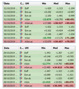 The measurements shown in Table 1 correspond to daily reports calculated on measurements performed continuously at a frequency of 1 Hz (1 measure per second) for each measuring channel. The minimum, average and maximum daily values are shown over a period of 4 days: