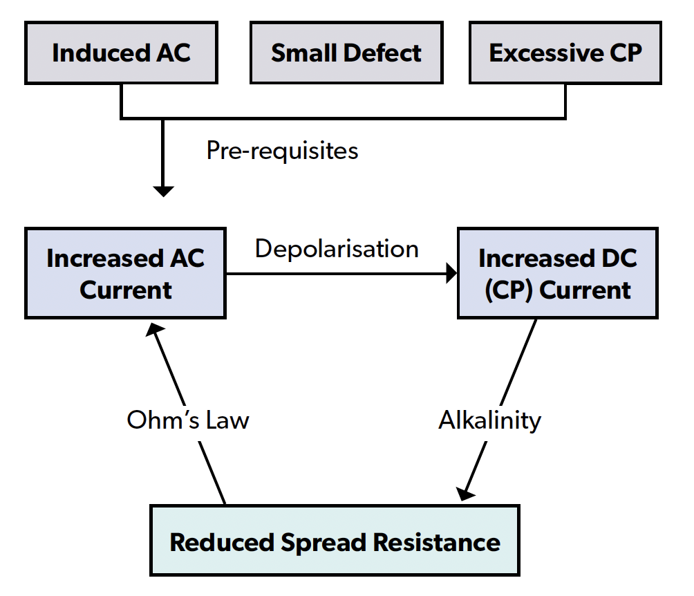 For pipelines with applied cathodic protection, AC corrosion development requires simultaneous coexistence of induced AC, excessive cathodic protection, and small coating defects. Under these conditions: