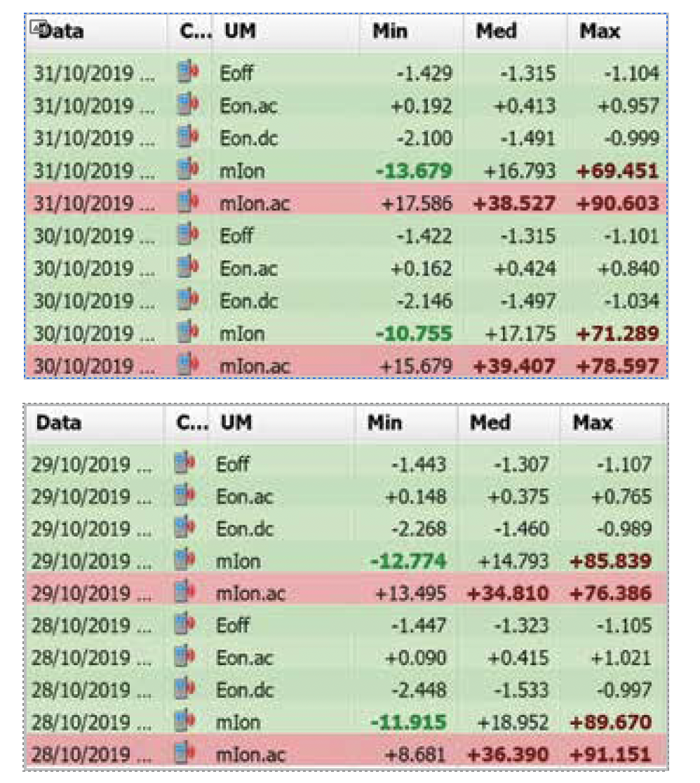 The measurements shown in Table 1 correspond to daily reports calculated on measurements performed continuously at a frequency of 1 Hz (1 measure per second) for each measuring channel. The minimum, average and maximum daily values are shown over a period of 4 days: