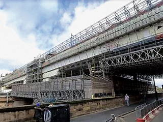 Very complex scaffolding was required. Traditional scaffolding that relies on ground support could not be used and due to the interface with Edinburgh’s key railway station (Waverley) and the low capacity of the roof, scaffolding had to be suspended from the bridge itself. This required multiple stages of design and checks.