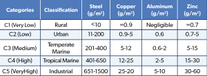 The following table is useful to put the above corrosion rates into context for the four test regions above.