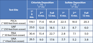 Table 3 shows the calculated chloride and sulfate deposition rates for each test site over each exposure. The PSCA site has four to seven times the amount of chlorides when compared to UAF and UAA, the PAA test sites. Figure 6 depicts the corrosion rates for 1008 carbon steel (UNS G10080) for a 12-month exposure period. The carbon steel samples at the PSCA site exhibited corrosion rates at least four times greater than the carbon steel samples exposed at UAF, PAA, and UAA.